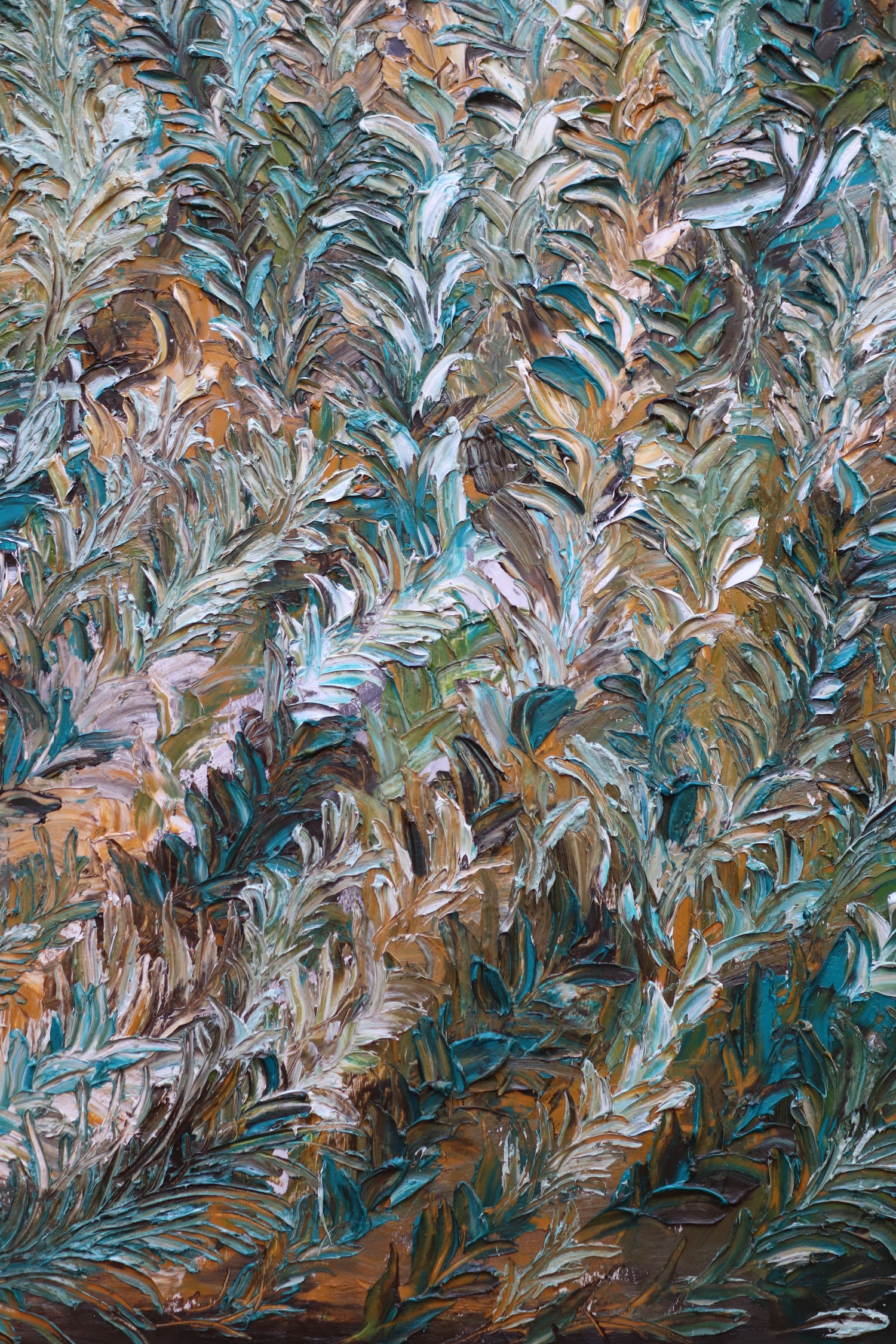 Cette toile est née d’un élan instinctif, presque végétal. En travaillant la matière de façon dense et gestuelle, j’ai voulu laisser parler la nature à travers moi — sans chercher à la représenter, mais plutôt à la faire ressentir. Les formes feuillues, les couches superposées, les teintes terreuses et lumineuses m’ont guidée vers une sorte de forêt intérieure, où chaque geste rappelle une croissance, un mouvement, un souffle.