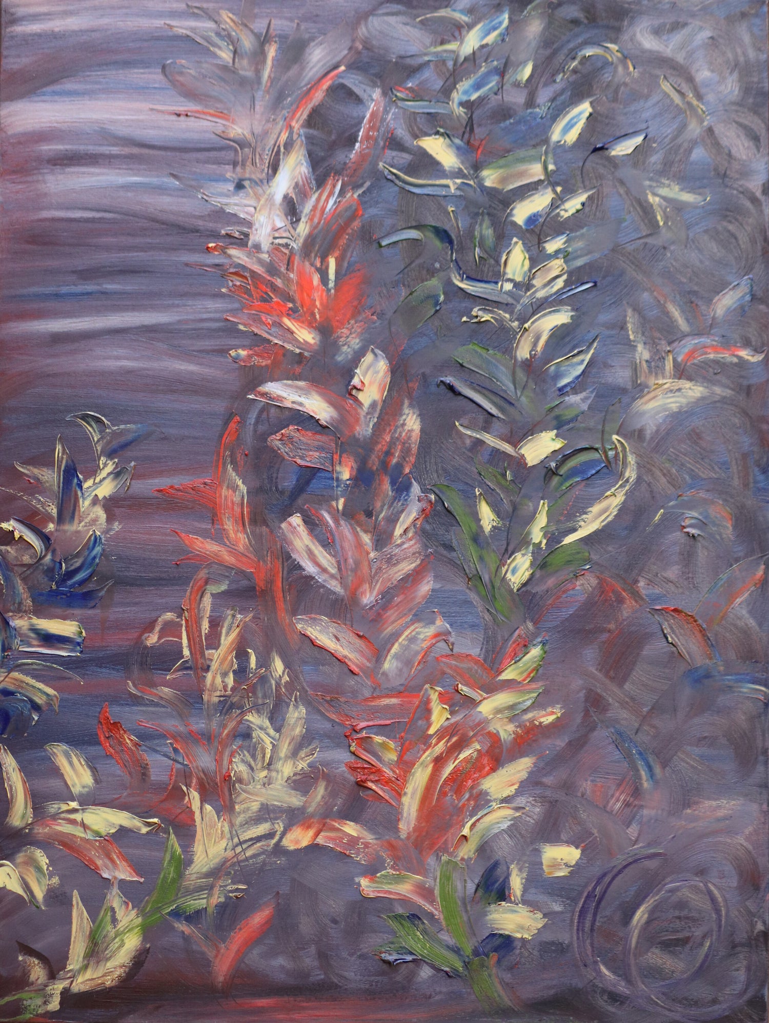Cette œuvre explore la tension entre matière et transparence, mouvement et silence. Des nuances sourdes de pourpre, de bleu et de gris tissent un fond vaporeux, presque cosmique, où des touches plus vives — rouges, jaunes, vertes — s’élèvent comme des souffles de vie. On devine une nature discrète mais tenace, qui respire à travers les voiles de peinture.