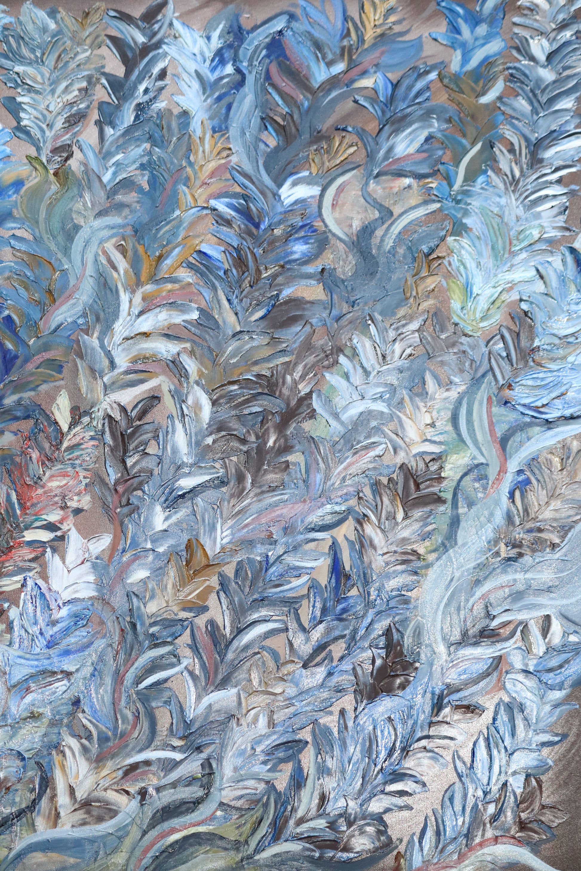 Dans une harmonie de tons minéraux et végétaux, l’artiste sculpte la lumière par la matière. Les empâtements, tantôt denses, tantôt aérés, laissent émerger des formes intuitives qui rappellent la flore, le vent, ou la mémoire d’un paysage oublié. Loin de toute représentation directe, la toile invite à ressentir plutôt qu’à nommer.
